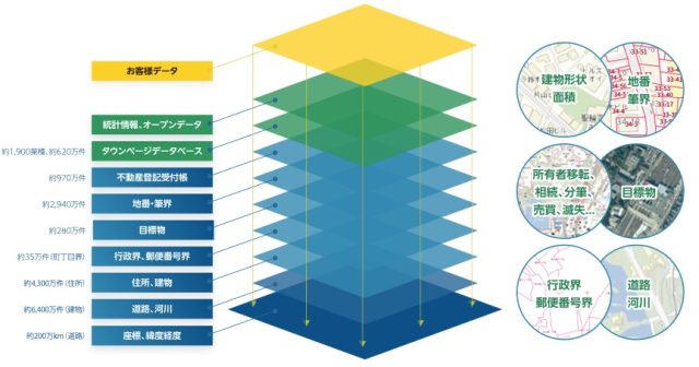 更にオプションサービスである「不動産登記受付帳データ」は、全国の法務局から情報を入手し位置情報を付加した不動産登記情報で、当社の地図と連携し、土地・物件の洗い出しや不動産調査などに活用いただけます。