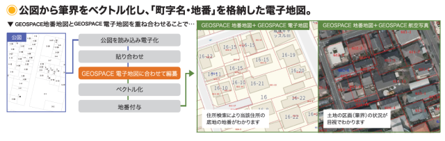 エヌ・ティ・ティ・インフラネット株式会社では、公図や自治体で整備した地番図の筆界をベクトルデータとして電子化し地番情報を付与した「GEOSPACE地番地図」をご提供しております。当社の「GEOSPACE電子地図」と同様のShapefileを採用しており、重ねて利用することで地番からの位置や住所検索が可能です。