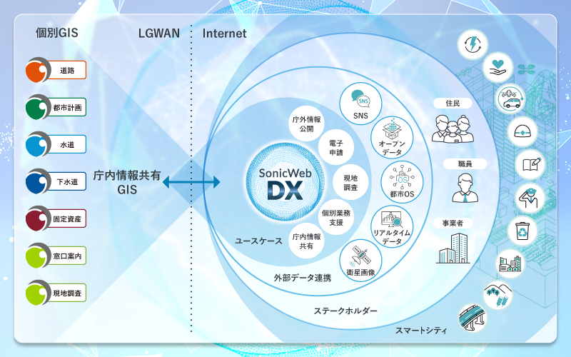 SonicWeb-DXのほかに、行政GISとして、統合型GIS(庁内情報共有GIS)や公開型GISをはじめ、各課業務に特化した個別業務支援GISをラインナップでご紹介いたします。