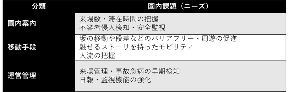 公園運営においては、来場者数や滞在時間の把握、シーズン外や夜間の不審者侵入検知、安全監視、バリアフリー移動、事故・急病の早期検知、日報・監視機能強化など、多岐にわたる課題が存在します。限られた予算の中で維持管理とサービス向上を両立する必要があり、デジタル技術の活用が不可欠となっています。デジタル技術の効果的な活用方策の検討のため、既存資料の分析や関係者へのヒアリングを通じて、園内の具体的な課題を洗い出しました。