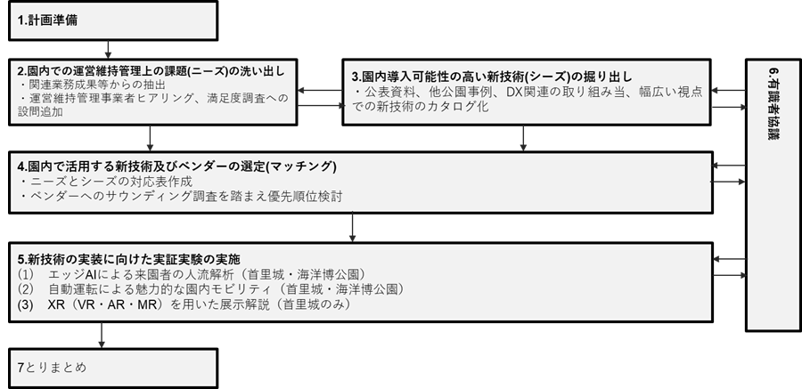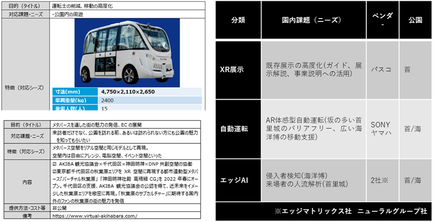 弊社では、課題解決に資する新技術として、エッジAI、自動運転サービス、XR(VR・AR・MR)技術などの調査を行いました。その上で、これらの技術を有するベンダーの協力のもと、短期的な実装可能性、ビジネス化・実用化の期待、コスト面などを評価し、実証実験の対象とする技術を選定しました。例えば、首里城公園・海洋博記念公園の課題に対して、XR展示の高度化(ガイド・展示解説・事業説明への活用)、AR体感型自動運転(バリアフリー移動支援)、エッジAIによる侵入者検知・人流解析などを選定しています。