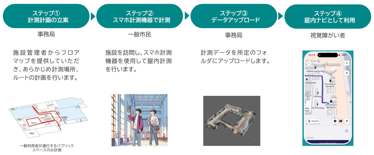 屋内ナビゲーションデータを整備するには、対象エリアの計測が必要となります。また、屋内計測には施設管理者の理解と協力が欠かせません。そのためには、まず社会全体での機運醸成が重要であると考えました。