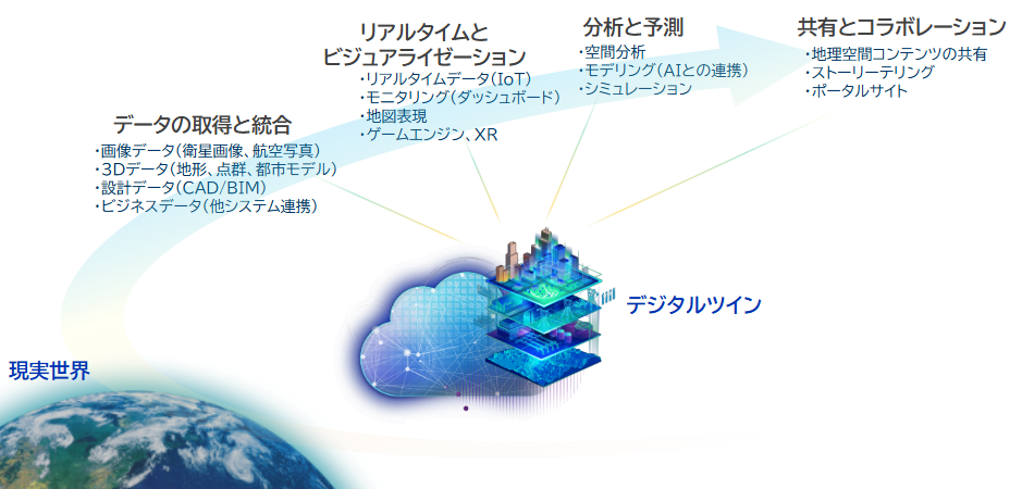 デジタルツインは、単なる3Dモデルではなく、データの取得・統合から、分析・予測、共有・協力までを支える情報ライフサイクル全体を包含する概念です。ArcGIS はこのライフサイクルを支えるエコシステムとして、現場とオフィス、行政と市民、設計者と運用者をつなぐ「デジタル神経系」の役割を果たしています。