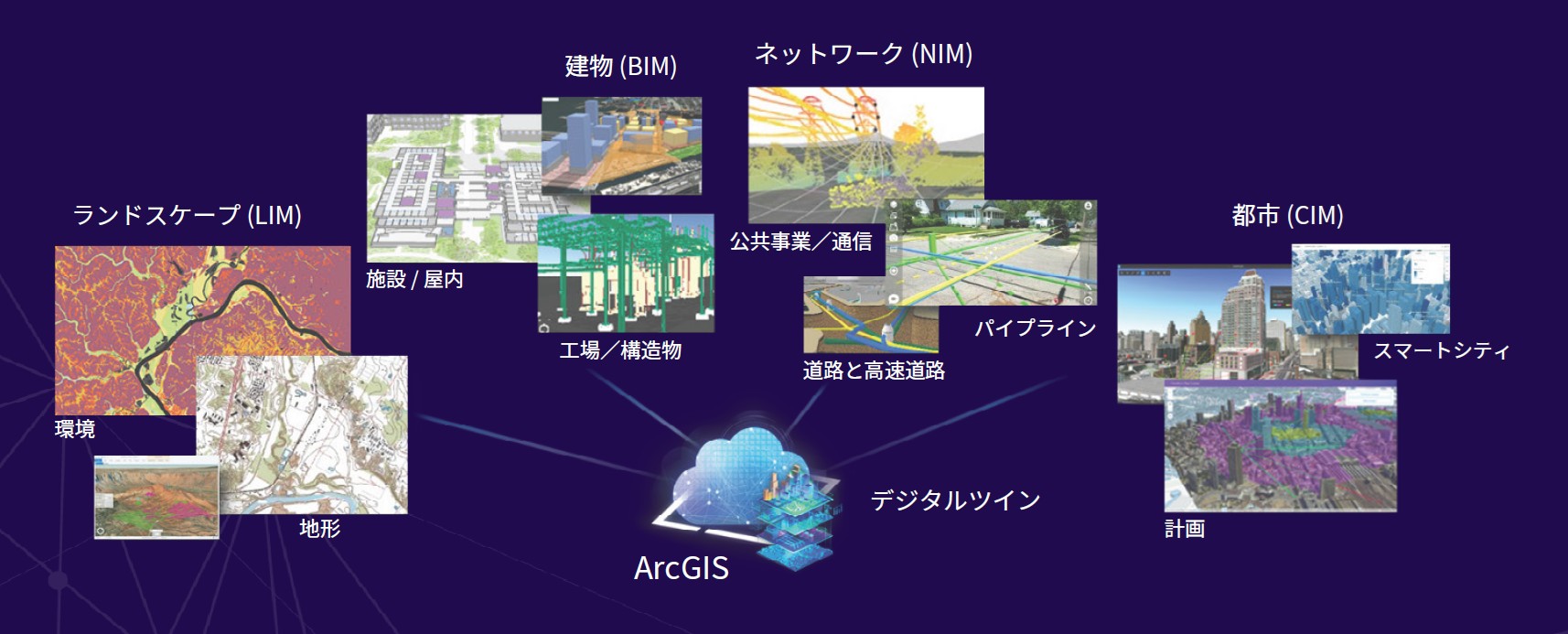 ArcGIS は、こうしたデジタルツインの基盤として、建物情報モデル(BIM)、ネットワーク情報モデル、都市情報モデルなど、複数の情報モデルを統合・接続する機能を備えています。これにより、単一の施設から都市全体、さらには自然環境までを対象とした包括的なモデリングが実現できます。