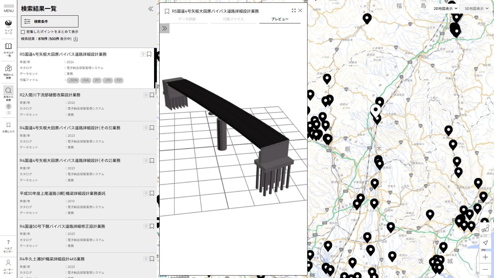 国土交通DPFの大きな特徴のひとつが、「電子納品保管管理システム」との連携です。約14.7万件の業務・工事の概要を調べることができます(2025年時点)。工事・業務について、関連するBIM/CIMモデル(IFC形式)やCAD図面(P21形式)が公開されており、個別のファイル単位でダウンロードすることが可能です。